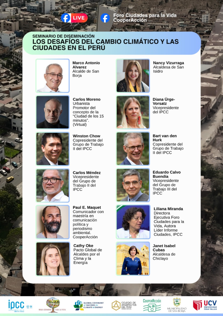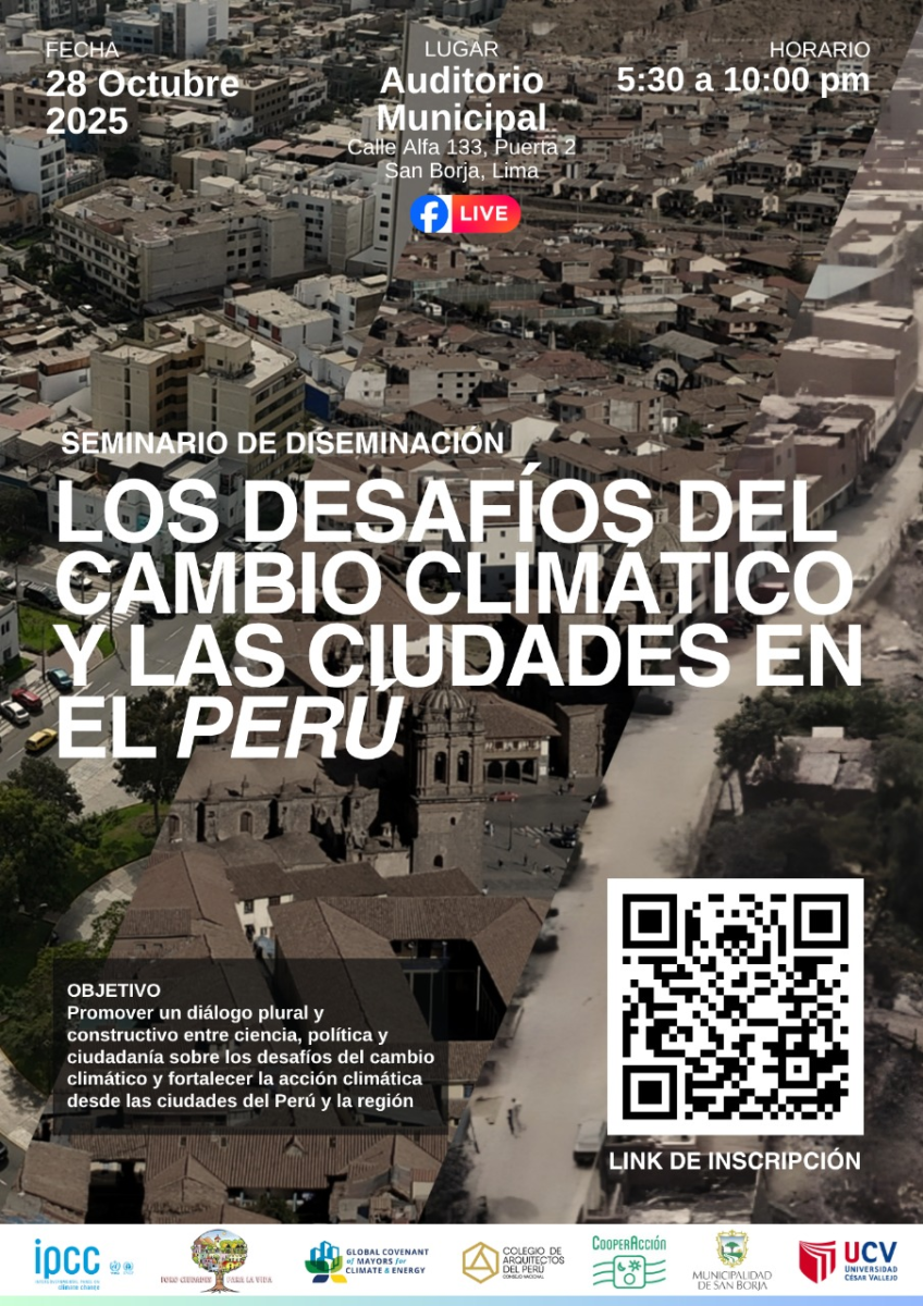 Como parte de este evento mundial, el martes 28 de octubre se desarrollará el Seminario Internacional Diseminación IPCC “Los desafíos del Cambio Climático y las Ciudades en el Perú”, un espacio de diálogo entre investigadores, autoridades, sector privado y sociedad civil sobre el papel de las ciudades frente a la crisis climática.