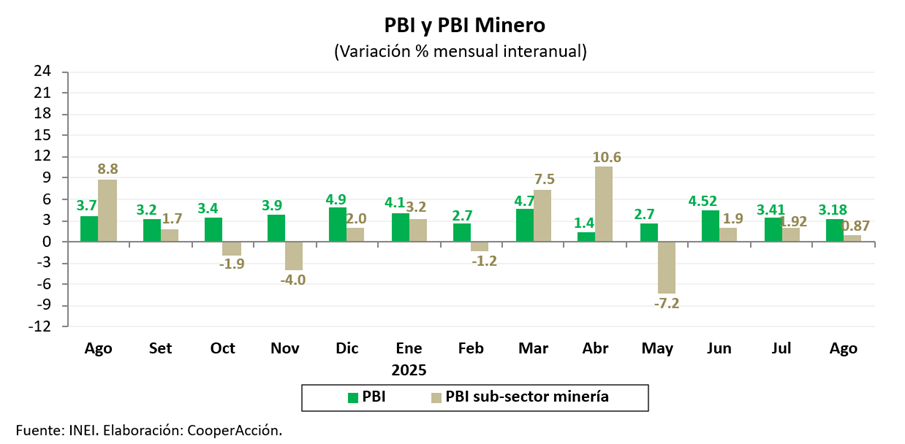 La minería metálica registró un crecimiento de apenas un 0.87% respecto de agosto 2024. Este crecimiento interanual se explica por un mayor volumen de producción de zinc, oro, hierro, plata, plomo y estaño.