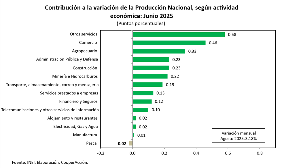 La producción nacional tuvo un aporte positivo de doce sectores. Destacaron los rubros Otros Servicios, Comercio, Agropecuario y Administración Pública y Defensa. El sector Pesca tuvo incidencia negativa en la producción nacional (-0.02 puntos porcentuales).