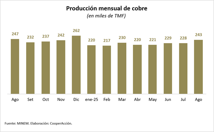 La producción de cobre, correspondiente al mes de agosto 2025, fue de 243 mil toneladas métricas finas (TMF), 1.6% menos que el mismo periodo de 2024. En cuanto a la variación mensual, se tuvo un incremento de 6.5%. Actualmente, los mejores resultados se explican por las mejores leyes de cobre obtenidas en Las Bambas.