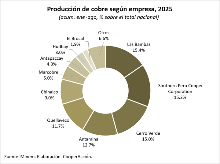 Las Bambas mantiene, desde hace unos meses, su posición como el principal productor de cobre en el país, con una participación del 15.4% del total nacional. Le siguen Southern Perú Copper Corporation (15.3%), Sociedad Minera Cerro Verde S.A. (15.0%) y Antamina (12.7%).