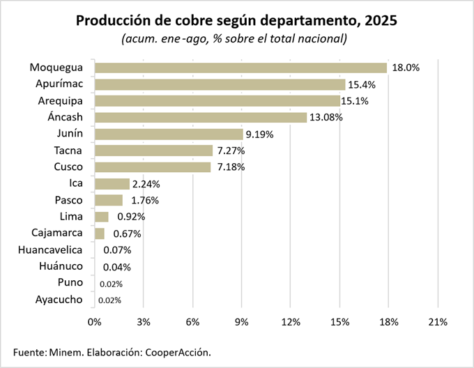 En cuanto a las regiones productoras de cobre, Moquegua lidera el ranking con un 18% del total nacional. Le siguen Apurímac, Arequipa y Áncash con 15.4%, 15.1% y 13.08% respectivamente.