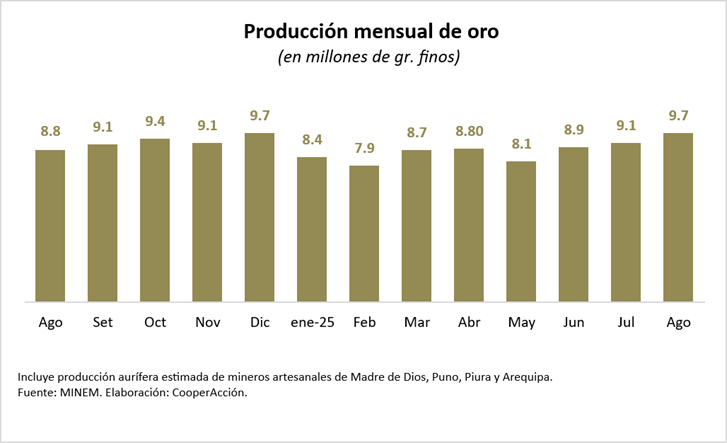 La producción de oro alcanzo 9.7 millones de gramos finos en agosto de 2025, lo que representa un aumento de 6.1%, respecto del mes anterior y 8.1% en relación a agosto 2024. Este aumento se debe al mejor desempeño de Minera Yanacocha en los últimos meses.