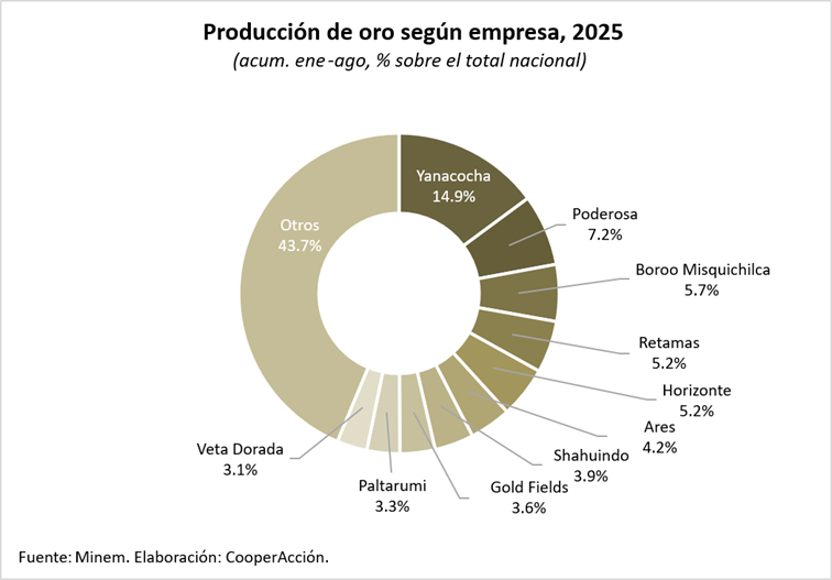 A nivel de titulares mineros, Yanacocha lidera la producción con una participación de 14.9% del total nacional, seguida por Minera Poderosa, con 7.2%, Boroo Misquichilca S.A., con 5.7% y Minera Aurífera Retamas con 5.2%. Cabe destacar que el grupo de empresas de menor envergadura, agrupadas en Otros, tiene una participación de 43.7% de la producción nacional, lo que refleja la importancia que ha alcanzado la pequeña minería, la artesanal, la informal y la abiertamente ilegal.