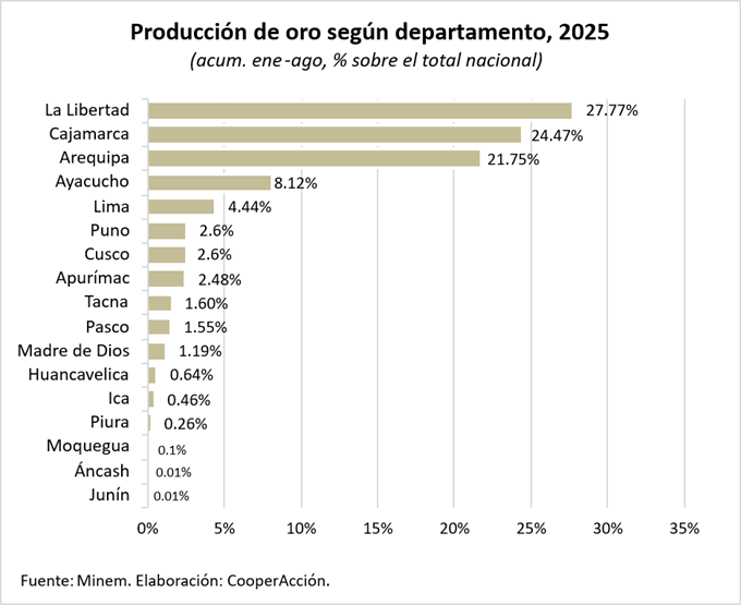 En cuanto a la producción departamental de oro, los tres primeros puestos abarcan más del 70% de la producción nacional. El departamento de La Libertad lidera desde hace tiempo la producción de oro nacional con 27.77%, le siguen Cajamarca, que ha recuperado el segundo lugar con 24.47% y en tercer lugar Arequipa con 21.75%.