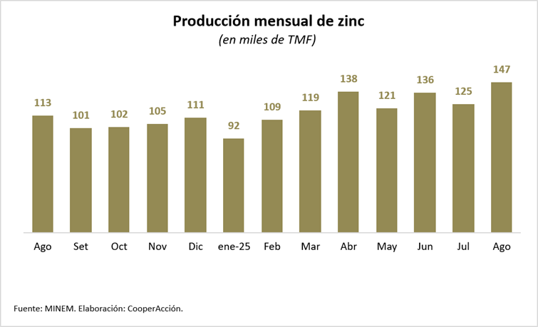 En cuanto a la producción de zinc, en agosto de 2025 se alcanzó las 147 mil toneladas métricas finas (TMF), un incremento de 17.2% en relación al mes anterior y 29.2% más que en agosto 2024. Es, nuevamente, el metal con mejor desempeño del periodo debido a la mayor producción de Minera Antamina.