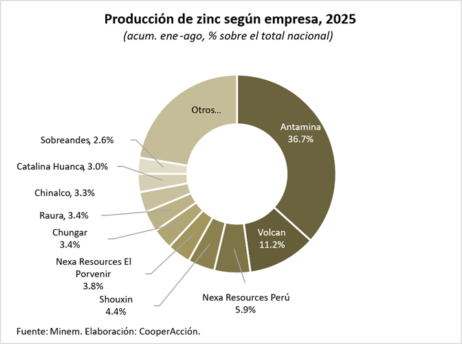 Compañía Minera Antamina S.A. lideró la producción de zinc, con 36.7% del total nacional. Le siguen Volcan, con 11.2% de participación, Nexa Resources con 5.9% y Shouxing con 4.4%.