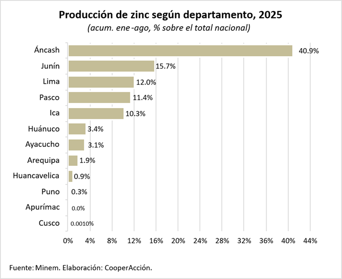 Finalmente, a nivel departamental, la producción de zinc es encabezada por Áncash, con 40.9% del total nacional. Le siguen Junín, Lima y Pasco, con 15.7%, 12.0% y 11.4%, respectivamente.
