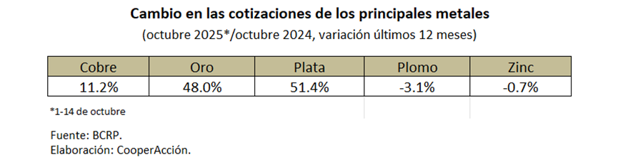Las cotizaciones de la plata, el oro y el cobre han registrado aumentos significativos en los últimos 12 meses, consolidando el nuevo ciclo de precios altos. La plata aumentó 51.4%, el oro 48% y el cobre 11.2%. En contraste, el plomo y el zinc registraron 3.1% y 0.7% de disminución en sus cotizaciones interanuales.