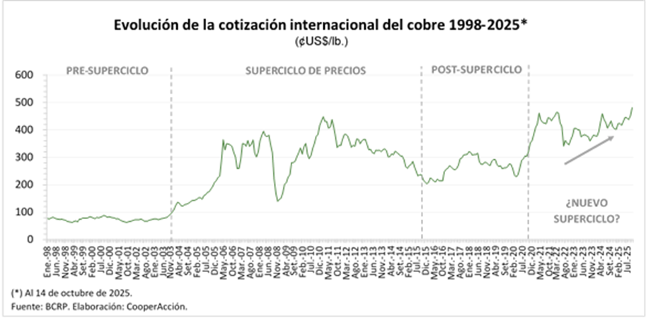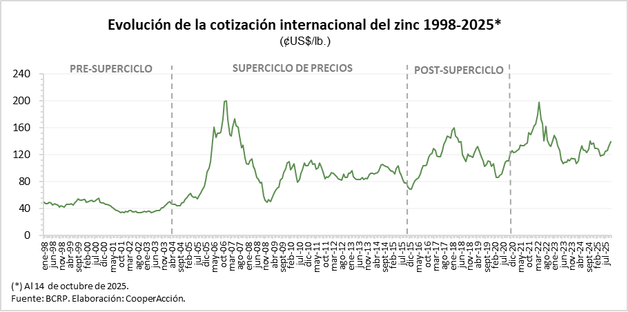 Finalmente, el zinc tuvo un precio promedio de US$ 1.40 por libra, lo que supone un aumento de 5.2%, respecto a setiembre y de 1.4% desde enero de 2025. En comparación a octubre 2024, la cotización ha caído 0.7%. El aumento mensual entre setiembre y octubre puede explicarse, sobre todo, por la caída de los inventarios en la Bolsa de Metales de Londres.