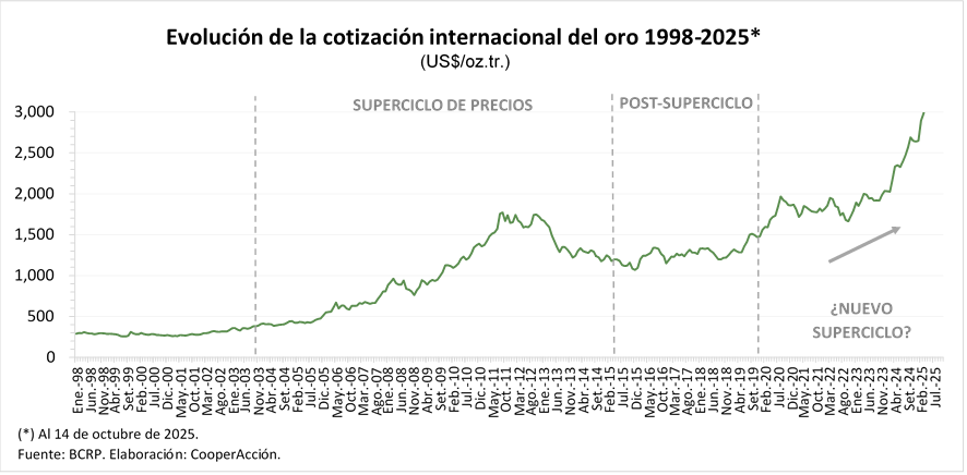 El oro registró un precio promedio de US$ 3984 por onza troy, lo que representa un incremento de 51% desde inicios de 2025. La cotización ha mantenido una tendencia al alza impulsada por la mayor demanda y su característica de activo de refugio y hechos como la declarada pausa de operaciones del gobierno estadounidense y las expectativas de nuevos recortes de tasas de interés por la Reserva Federal.