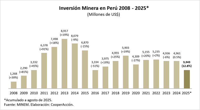 Hasta agosto de 2025 se ha registrado una inversión minera acumulada valorizada en US$ 3343 millones, lo que representa un aumento de 12.8% respecto del año anterior.