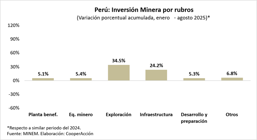 De manera desagregada, la inversión en exploración experimentó una variación del 34.5%, en relación al año anterior. Le siguieron, con una tendencia positiva más moderada, los rubros de Infraestructura (24.2%), Otros (6.8%), Equipamiento minero (5.4%), Desarrollo y Preparación (5.3%) y Planta Beneficio (5.1%).