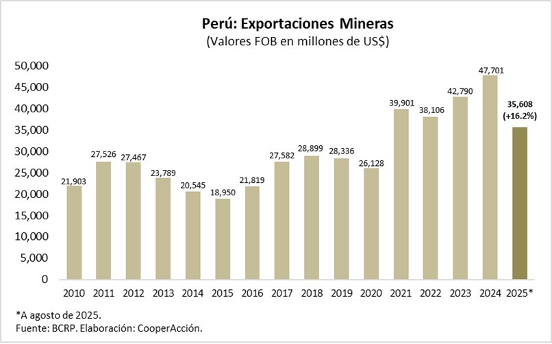 Hasta agosto de 2025 las exportaciones mineras se han incrementado en 16.2%, respecto al mismo periodo en 2024. Durante los primeros ocho meses del año, el subsector minero lideró las exportaciones de productos tradicionales en términos de valor FOB, alcanzando US$ 35 608 millones.