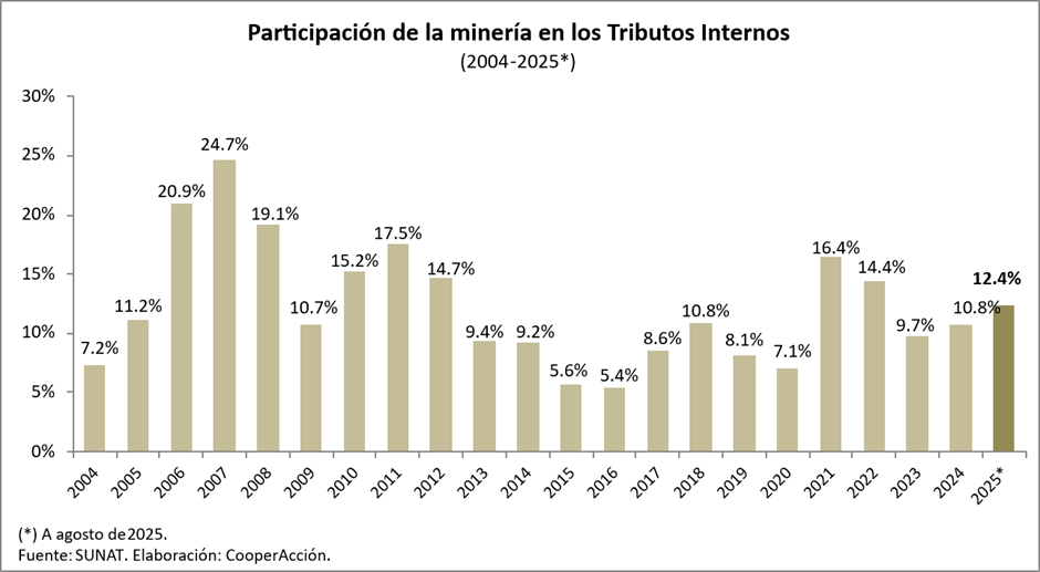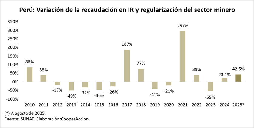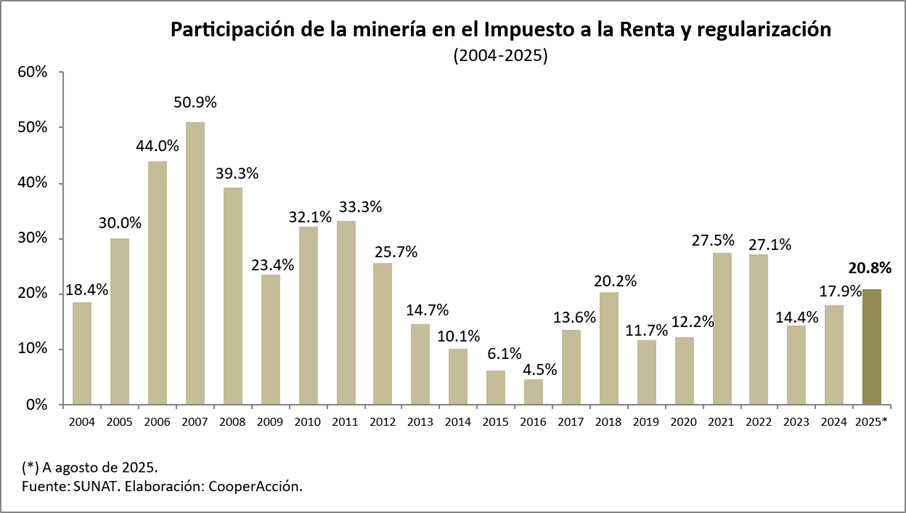 En relación con el aporte tributario minero, el pago del Impuesto a la Renta (IR) de tercera categoría de este sector, incluida la regularización, se incrementó en 42.5% hasta agosto de 2025.