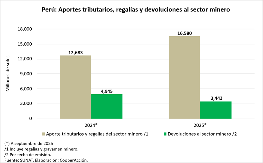Hasta septiembre de 2025, el sector minero registró un aporte total ̶ aporte tributario más regalía- de S/16 580 millones y devoluciones por S/3443 millones, lo que significa un aporte neto de S/13 137 millones. En el mismo período de 2024, el sector minero registró un aporte neto de S/7738 millones, monto 69.77% menor al registrado este año.