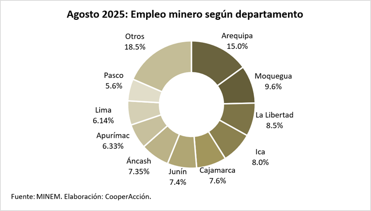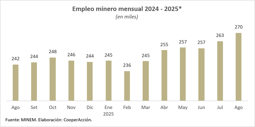 El empleo minero, aunque a tasas moderadas, ha seguido creciendo. En agosto de 2025 se registró un aumento de 10.7% en comparación con el mismo periodo de 2024. Según el boletín estadístico del Ministerio de Energía y Minas, en el Perú laboran 270 095 personas en la minería formal.