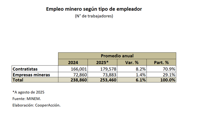 Del total, el 70.9% trabaja a través de empresas contratistas, mientras que apenas el 29.1% tiene una relación directa con las empresas mineras. En agosto, los empleos de las contratistas aumentaron en un 8.2% y los empleos directos con las empresas mineras, aumentaron en un 1.4% (en comparación con el mismo periodo de 2024).