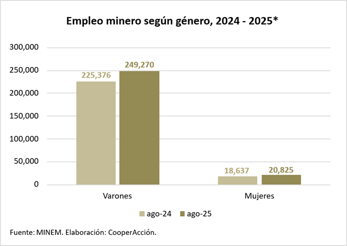 Al desagregar las cifras por género, la participación de mujeres sigue estando por debajo del 10%: las cifras a agosto muestran una participación femenina en las labores mineras de apenas el 7.7% del total. Aun así, se puede notar una cierta mejora en inclusión de género ya que al comparar con 2024, la participación de mujeres ha aumentado 11.7%.