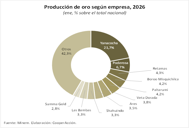 Minera Yanacocha S.R.L. mantiene el liderazgo de la producción aurífera a nivel nacional, con una participación de 21.7% del total. Le siguen Minera Poderosa (6.7%), Retamas (4.3%), y Boroo Misquichilca S.A., junto con Paltarumi (ambas con 4.2%). Por su parte, la participación de empresas como Veta Dorada, Ares, Shahuindo y Las Bambas se ubican en un rango de entre 3% y 4% de la producción nacional. Cabe destacar que el grupo de productores agrupados en el rubro Otros representa el 42.3% de la producción nacional, lo que muestra que, en la actualidad, la producción de oro está altamente desconcentrada.