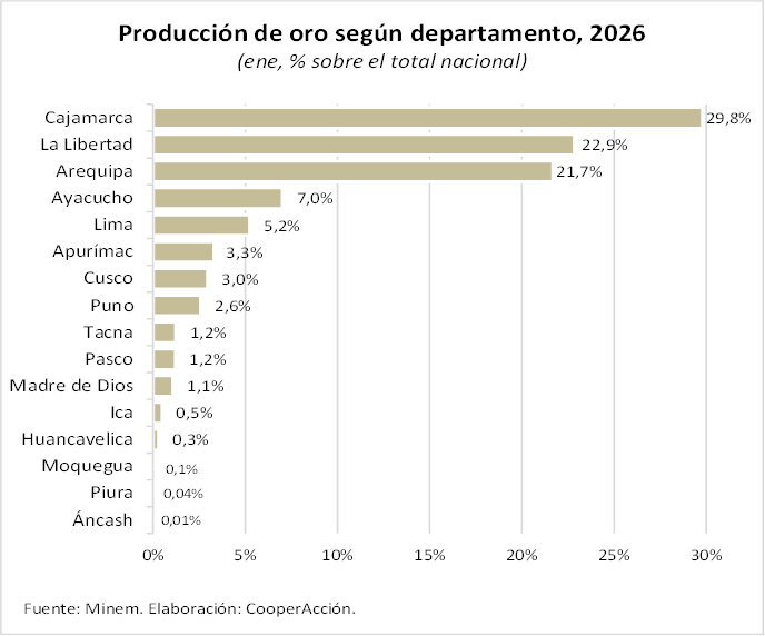 La producción por departamentos muestra a Cajamarca en primer lugar, con 29.8% del total nacional, lo que significa que este departamento ha recuperado, después de mucho tiempo, el primer lugar en este ranking. Le siguen La Libertad, con 22.9% y Arequipa, con 21.7%. Cabe destacar que tanto La Libertad (Pataz) como Arequipa (Caravelí) son zonas donde se concentra la actividad minera informal e ilegal.