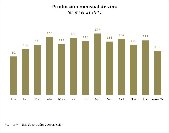 En enero de 2026, la producción nacional de zinc alcanzó las 105 mil TMF, lo que representa un incremento de 14.7% respecto al mismo mes de 2025. No obstante, en términos mensuales, la producción registró una disminución de 19.3% frente a diciembre de 2025.