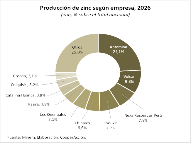 Compañía Minera Antamina S.A. lideró ampliamente la producción de zinc, con 24.1% del total nacional. Le siguen Volcan, con 9.8% de participación, Nexa Resources Perú con 7.8% y Shouxing con 7.7%. El mercado productor de zinc también presenta una participación relevante del rubro Otros, donde se agrupan las empresas de menor envergadura (mediana y pequeña minería), el cual ocupa el 25.0% de la producción nacional.
