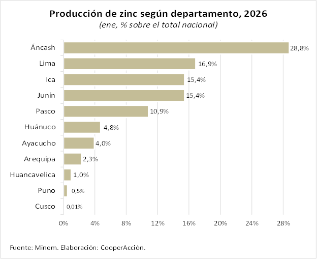 A nivel departamental, la producción de zinc está encabezada por Áncash, con 28.8% del total nacional. Le sigue Lima (16.9%), mientras que Ica y Junín registran participaciones de 15.4% cada una.