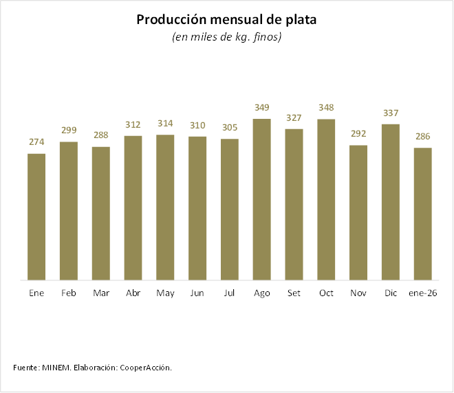 La producción de plata alcanzó los 286 mil kilogramos finos en enero de 2026, lo que representa un incremento de 4.5% respecto al mismo mes de 2025. No obstante, se observa una caída mensual de 15.2% frente a diciembre de 2025.