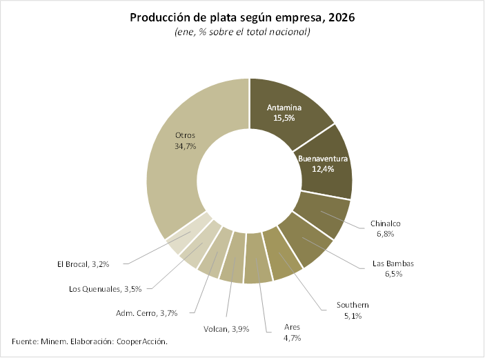 En cuanto a la producción de plata por empresas, Antamina sigue liderando con 15.5% del total nacional. Le siguen Buenaventura con 12.4%, Minera Chinalco Perú con 6.8%, Las Bambas con 6.5%, Southern con 5.1%, entre otras. Al igual que en el caso del oro, una proporción significativa de la producción se concentra en el rubro Otros, que agrupa a 61 titulares de menor envergadura y representa el 34.7% del total nacional.