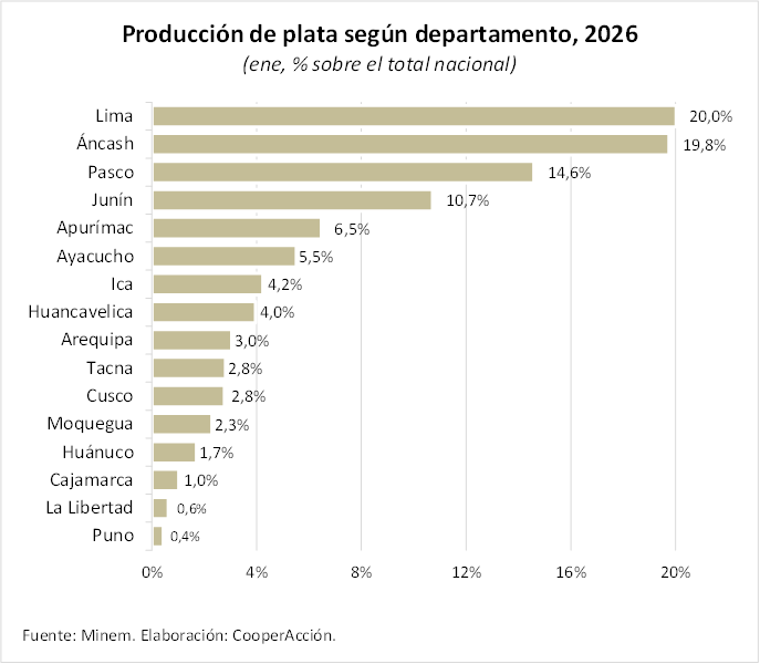 Lima y Áncash lideran el ranking de producción de plata con 20.0% y 19.8% respectivamente. Pasco y Junín ocupan el tercer y cuarto puesto con 14.6% y 10.7%. El quinto lugar corresponde a Apurímac, con el 6.5% de la producción nacional.