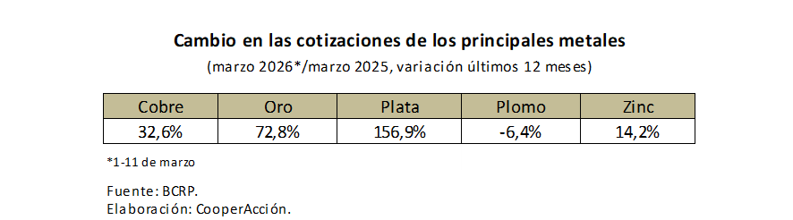 En los últimos doce meses, cuatro de los cinco metales monitoreados por CooperAcción registraron aumentos. El mayor incremento corresponde a la plata, con un alza de 156.9%, respecto a marzo de 2025. Le sigue el oro, con un aumento de 72.8% en el mismo período. El cobre también registró un incremento de 32.6%, mientras que el zinc muestra un aumento moderado de 14.2%. Solo el plomo presentó una cotización a la baja (-6.4%).