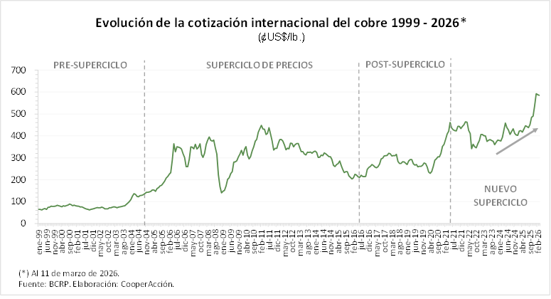 El precio del cobre se mantiene en niveles elevados. Tras el fuerte incremento observado a finales de 2025 y los picos alcanzados en enero de 2026, la cotización ha mostrado una ligera corrección en los últimos dos meses. Esta evolución se explica por la apreciación del dólar, así como por los temores de una menor demanda asociados al conflicto en Medio Oriente y los reportes de mayor producción en refinerías chinas, según el Banco Central de Reserva del Perú.