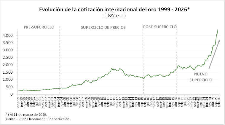 Por su parte, la cotización del oro alcanzó un promedio de US$ 5162 por onza troy, lo que representa un incremento de 72.8%, en comparación con marzo de 2025. Esta tendencia continuada de picos históricos en el precio se mantiene pues siguen las tensiones geopolíticas y, por consecuencia, una mayor demanda del metal amarillo como un activo seguro. A ello se suman factores financieros, como la cautela de la Reserva Federal de los Estados Unidos frente a la evolución de la inflación y la apreciación del dólar respecto a las principales divisas.