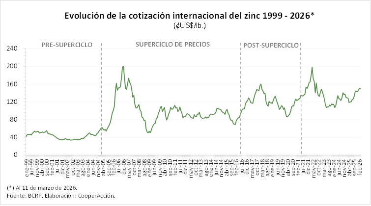Finalmente, el zinc sigue teniendo una cotización promedio de US$ 1.5 por libra en marzo de 2026, lo que representa un incremento de 14.2%, respecto de marzo de 2025. Esto se explica por los altos niveles de inventarios reportados en China, las preocupaciones sobre una menor demanda asociada al crecimiento de la economía mundial en un contexto de conflicto en Medio Oriente y la apreciación del dólar frente a sus principales contrapartes, según el Banco Central de Reserva del Perú.