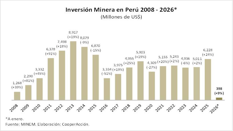 En enero de 2026, el subsector minero registró una inversión anual valorizada en US$ 398 millones, lo que significa un aumento de 8.9% en relación con el mismo mes del año anterior. Todo indica que la inversión en minería continúa al alza.