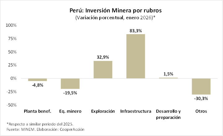 Desagregada por rubros, la inversión minera fue liderada por el componente de Infraestructura, con un incremento de 83.3%, seguido de Exploración (32.9%) y, en menor medida, de Desarrollo y Preparación (1.5%). No obstante, se registraron caídas en Plantas de Beneficio (-4.8%), Equipo Minero (-19.5%) y Otros (-30.3%).