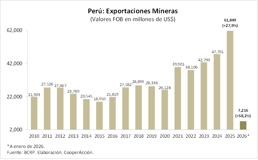 En enero de 2026, las exportaciones mineras se incrementaron en 58.2% respecto al mismo mes de 2025. El subsector minero lideró las exportaciones de productos tradicionales en términos de valor FOB, alcanzando US$ 7216 millones, lo que representa el 91.9% del total de exportaciones de productos tradicionales.