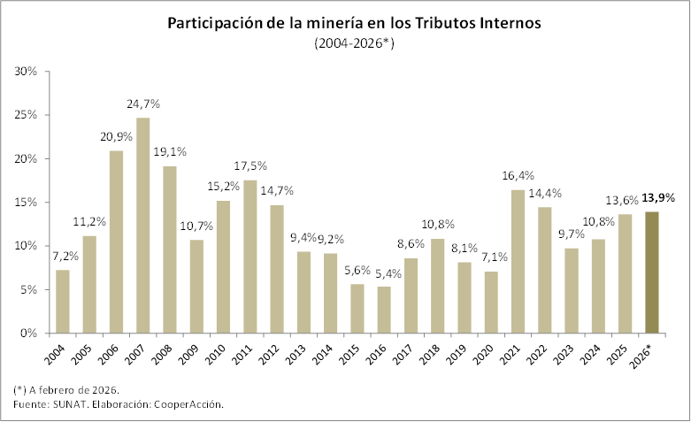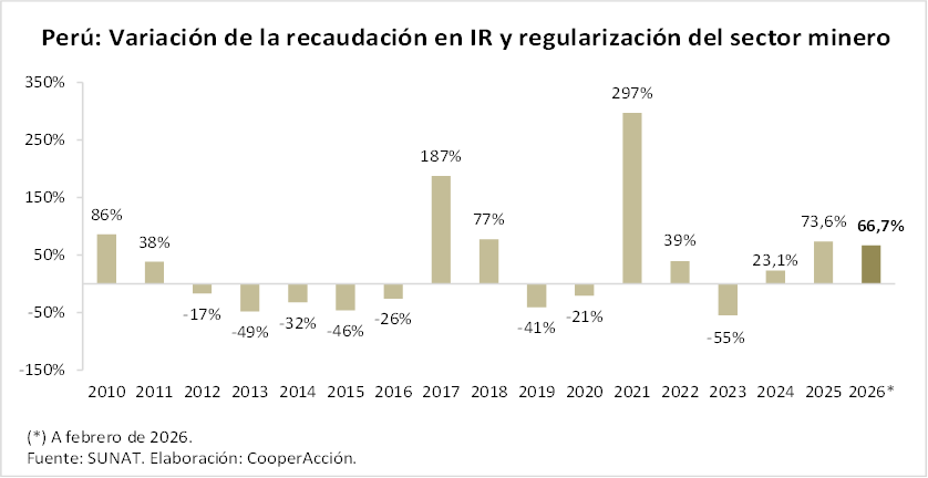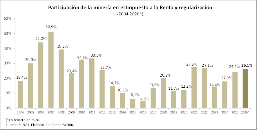 A febrero de 2026, el aporte tributario de la minería por el pago del Impuesto a la Renta (IR) de tercera categoría, incluida la regularización, se incrementó en 66.7% en comparación con similar período de 2025.