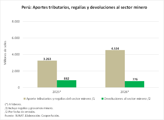 A febrero de 2026, el sector minero registró un aporte total —entre tributos y regalías— de S/ 4534 millones y devoluciones por S/ 776 millones, lo que resulta en un aporte neto de S/ 3578 millones. Esta cifra es mayor a la registrada en el mismo período de 2025, cuando el aporte neto ascendió a S/ 2381 millones.
