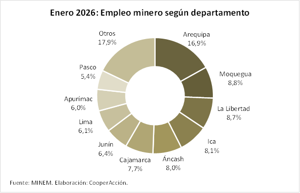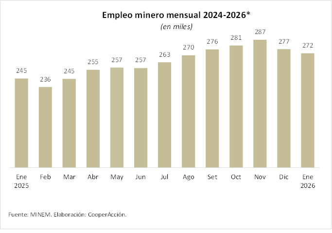 En enero de 2026, se registró un crecimiento en el empleo minero de 11.0%, respecto del mismo mes de 2025. Según el boletín estadístico minero del Ministerio de Energía y Minas, laboran en el sector minero formal 272 423 personas, una cantidad menor a la registrada en diciembre de 2025.