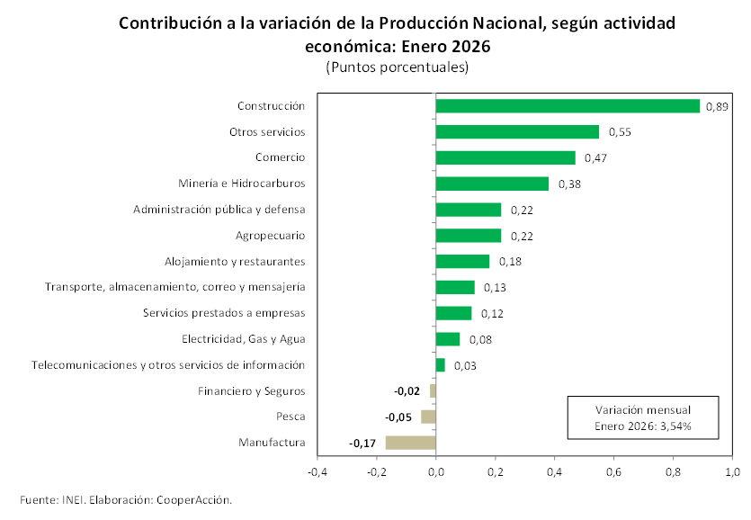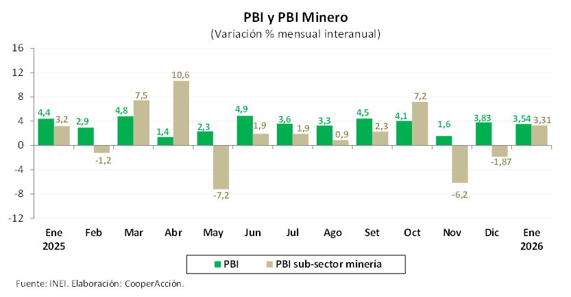 El reporte mensual del Instituto Nacional de Estadística e Informática (INEI) da cuenta de que, en enero de 2026, se registró un aumento del Producto Bruto Interno (PBI) de 3.54%, respecto al mismo mes de 2025.