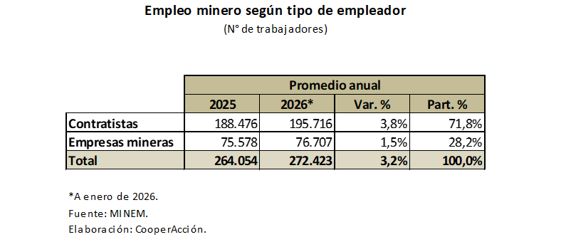 En enero de 2026, los empleos de las contratistas aumentaron en un 3.8% y los empleos directos con las empresas mineras, aumentaron en un 1.5% (en comparación con enero de 2025).