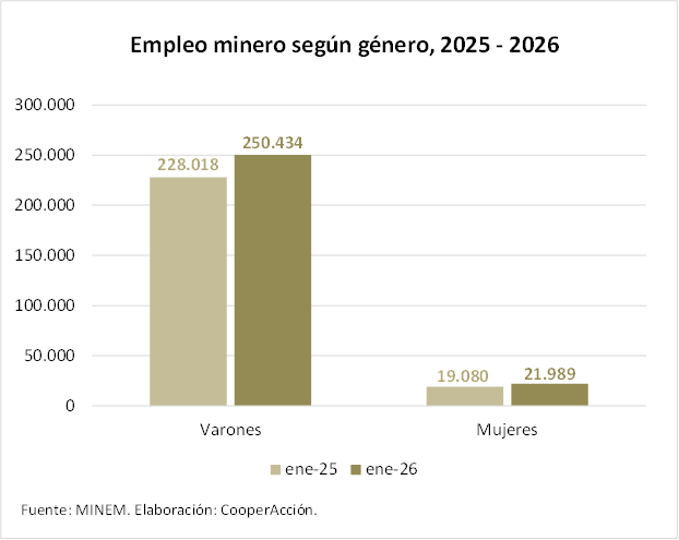 Al desagregar las cifras por género, la participación de las mujeres se mantiene por debajo del 10%: en enero de 2026, representa apenas el 8.1% del total del empleo minero, lo que implica un incremento de 0.4 puntos porcentuales respecto a la participación femenina registrada en el mismo mes de 2025. En este contexto, la predominancia masculina de la fuerza laboral minera continúa siendo un rasgo característico del sector.
