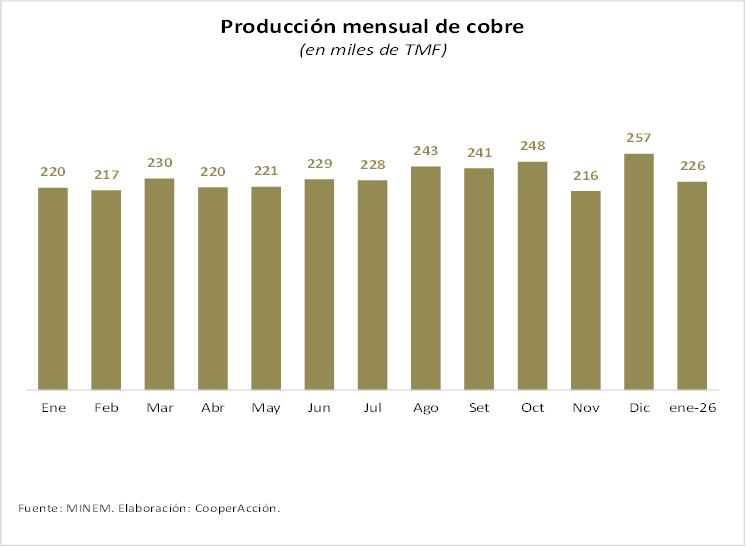 En enero de 2026, la producción de cobre alcanzó las 226 mil toneladas métricas finas (TMF), 3.0% por encima del mismo mes de 2025. En cuanto a la variación mensual, se registró una caída de 11.8%.