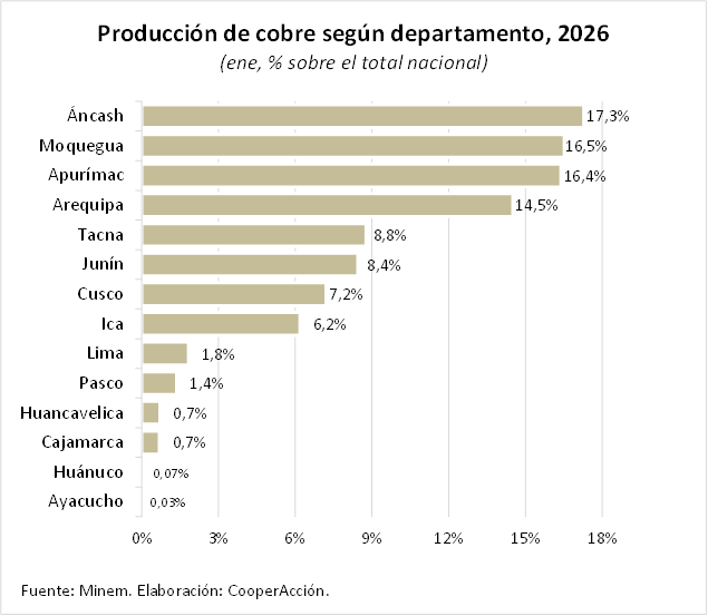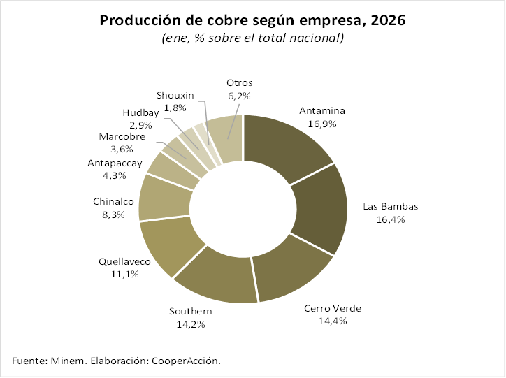 Antamina fue el principal productor de cobre en el país en enero de 2026, con una participación del 16.9% del total nacional. Le siguen Las Bambas (16.4%), Sociedad Minera Cerro Verde (14.4%) y Southern Perú Copper Corporation (14.2%).