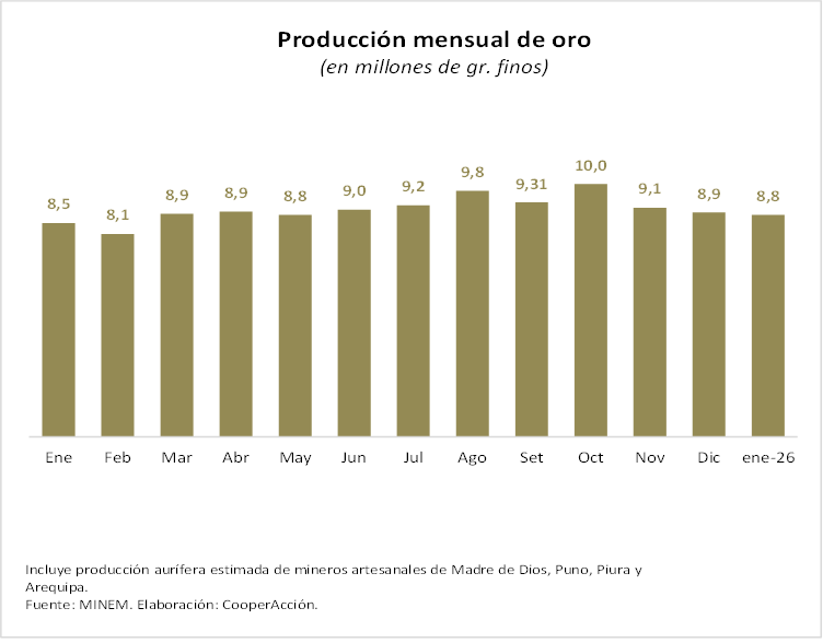 Por su parte, la producción de oro alcanzó los 8.8 millones de gramos finos en enero de 2026. Este volumen representa un incremento de 3.8% respecto al mismo mes de 2025, aunque registra una caída de 1.1% en comparación con el mes anterior.