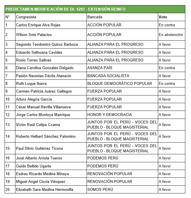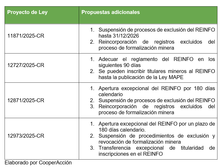 Cada proyecto planteó, principalmente, la extensión de la vigencia del Registro Integral de Formalización Minera (REINFO):