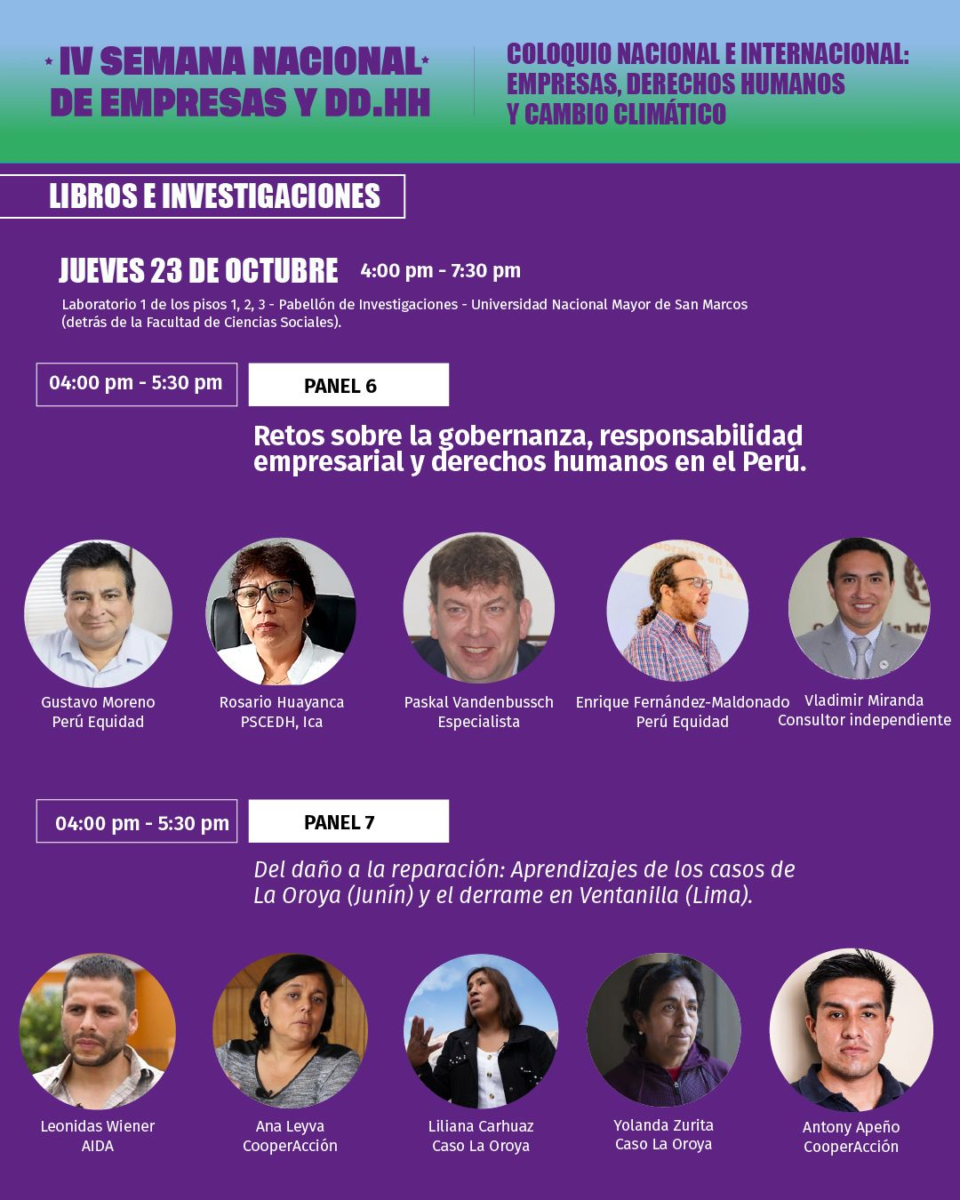 El 23 de octubre, las sesiones retomaron el análisis de la gobernanza ambiental y la responsabilidad empresarial, en una mesa conducida por Perú Equidad, que resaltó los retos del Estado frente al control de los impactos corporativos y la necesidad de marcos regulatorios más exigentes. En otra sesión, la organización AIDA revisó los casos emblemáticos de La Oroya (Junín) y el derrame de petróleo en Ventanilla (Lima), destacando los aprendizajes sobre reparación integral, justicia ambiental y el rol de las comunidades en la exigencia de rendición de cuentas.