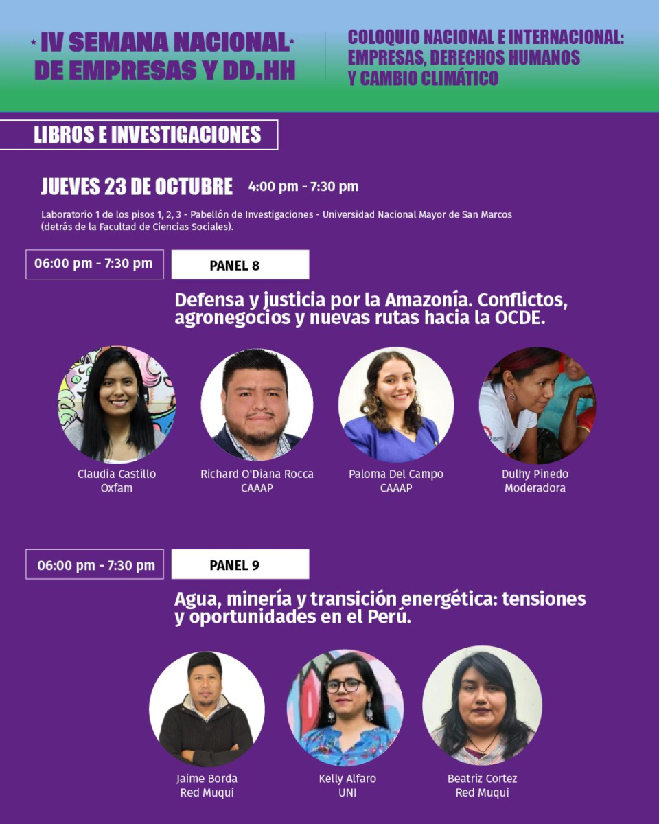 Por la tarde, el Coloquio cerró con dos paneles de alto contenido político y territorial. En “Defensa y justicia por la Amazonía” (Oxfam en Perú y CAAAP), se discutieron los conflictos socioambientales derivados del avance del agronegocio y la presión extractiva sobre los pueblos indígenas. Paralelamente, Red Muqui lideró el espacio “Agua, minería y transición energética: tensiones y oportunidades en el Perú”, que puso en evidencia las contradicciones entre los compromisos climáticos y la expansión de proyectos extractivos. En ambos espacios se insistió en la necesidad de avanzar hacia una ley de debida diligencia empresarial obligatoria, capaz de prevenir y reparar violaciones de derechos humanos y ambientales, y garantizar que la transición energética no se construya a costa de los territorios y comunidades.